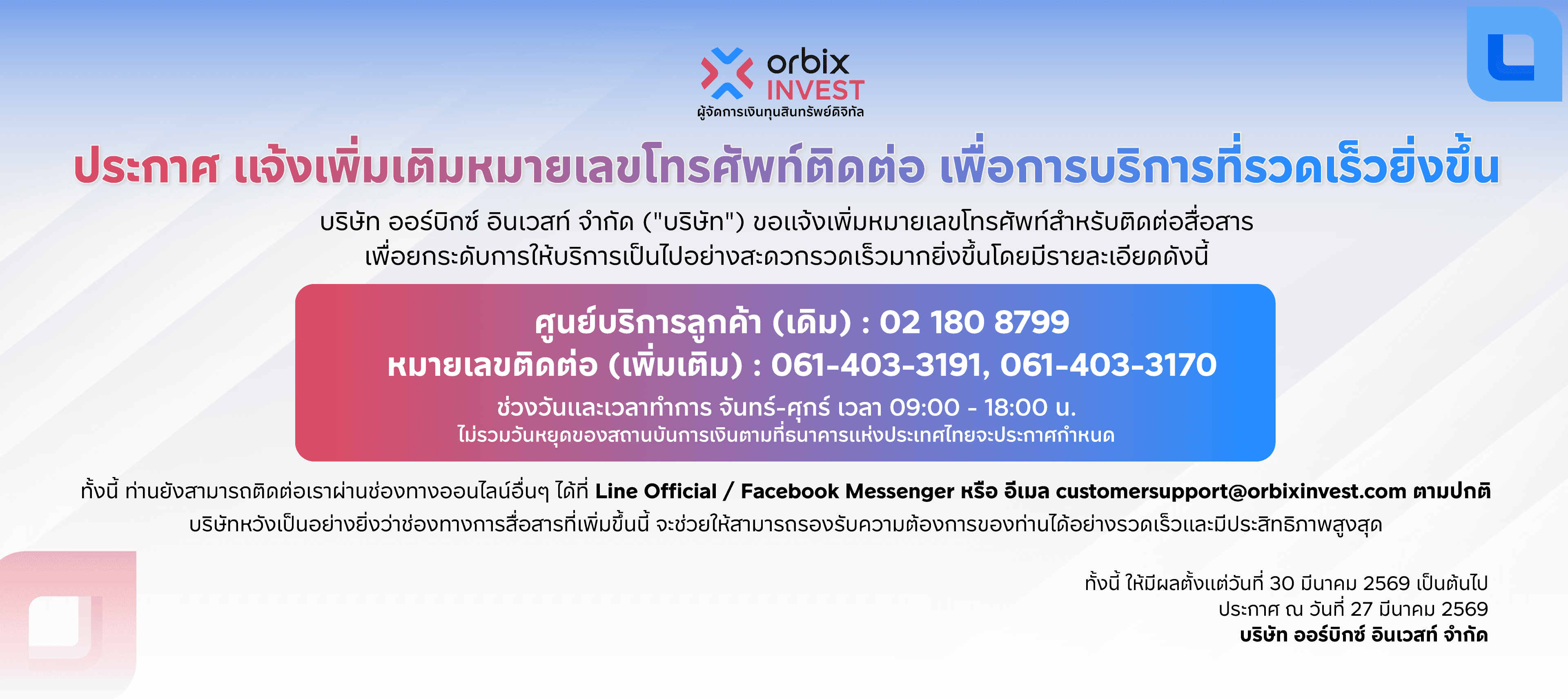 บริษัท ออร์บิกซ์ อินเวสท์ จำกัด ("บริษัท") ขอแจ้งเพิ่มหมายเลขโทรศัพท์สำหรับติดต่อสื่อสาร เพื่อยกระดับการให้บริการเป็นไปอย่างสะดวกรวดเร็วมากยิ่งขึ้นโดยมีรายละเอียดดังนี้