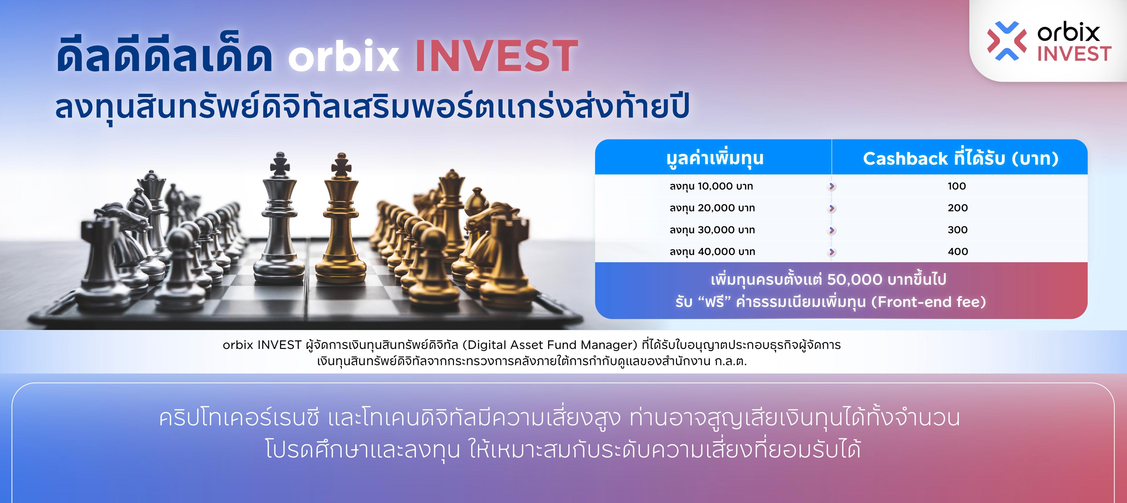 ลงทุนในกลยุทธ์ใดก็ได้กับ orbix INVEST ต่อครั้งครบทุกๆ 10,000 บาท รับ Cashback 100 บาท สูงสุดไม่เกิน 400 บาท หรือ ลงทุนครบต่อครั้งตั้งแต่ 50,000 บาทขึ้นไป รับ “ฟรี” ค่าธรรมเนียมเพิ่มทุน (Front-end-Fee) ตั้งแต่ 1 พ.ย. – 30 ธ.ค. 67